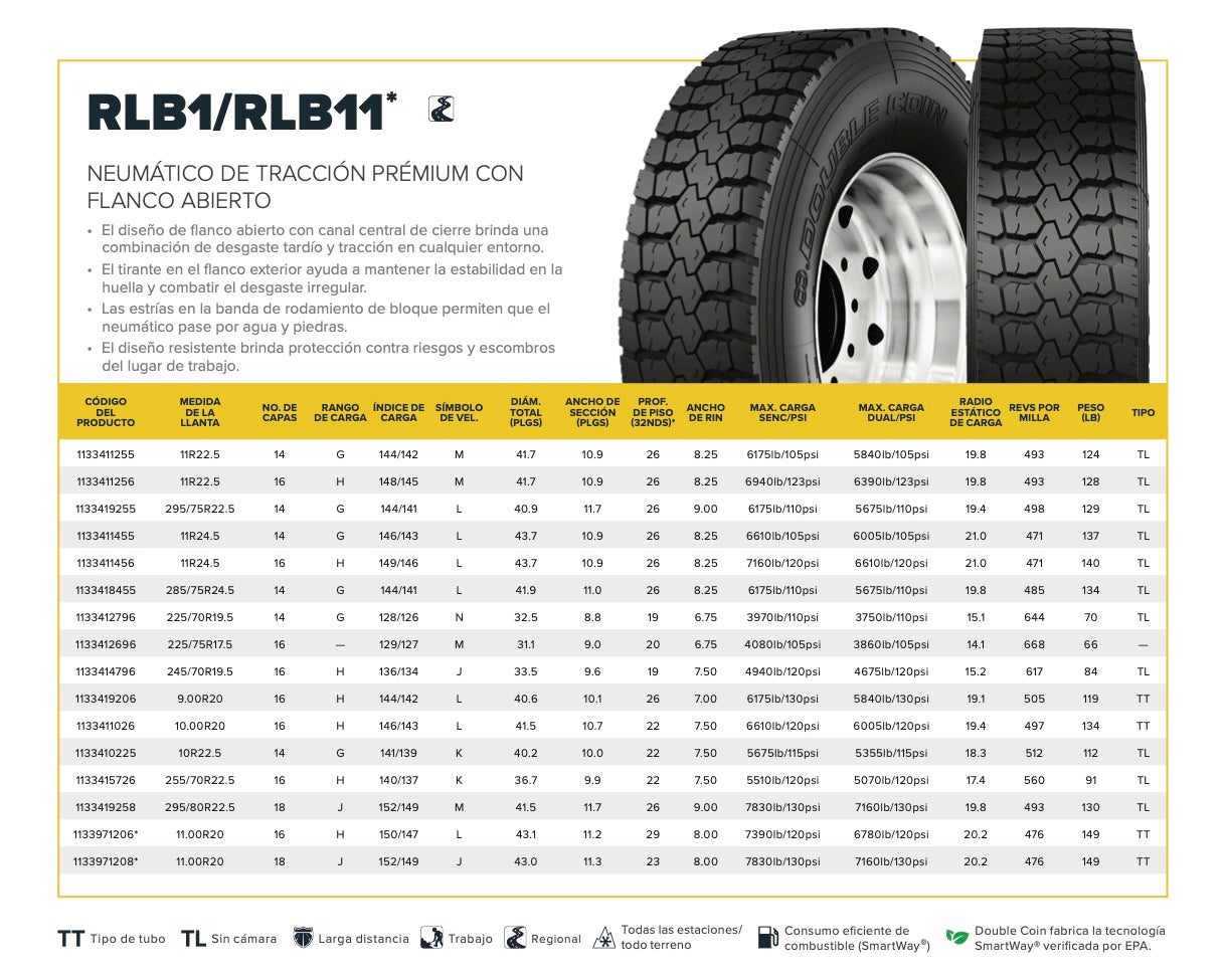 El Neumático Double Coin RLB1 para tracción, es ideal para camiones comerciales, ofreciendo una larga vida útil gracias a su diseño de banda de hombro abierto agresivo y profundo, que proporciona un agarre perfecto y tracción sólida en caminos regionales.